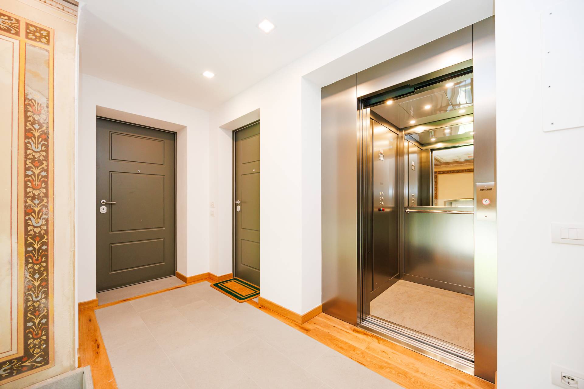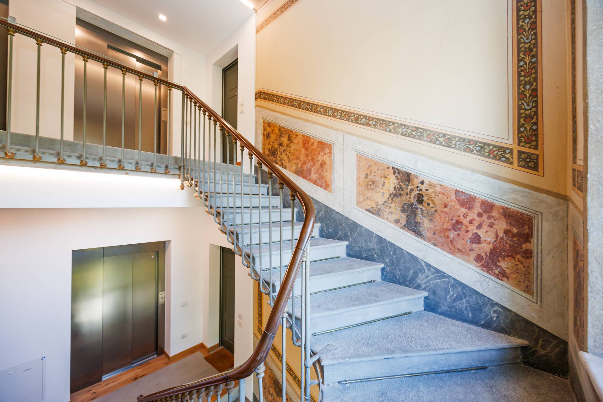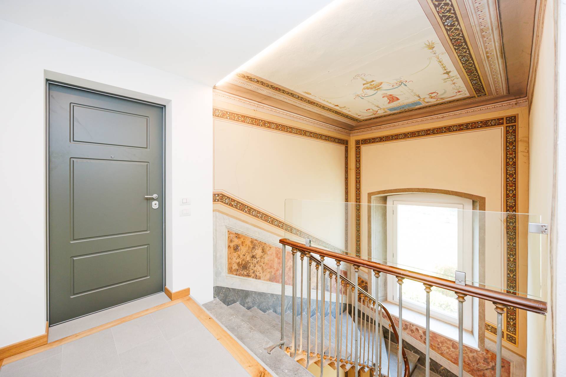 Recuperati affreschi nel vano scale, utilizzato la scala originale della villa che da eleganza e unicità alle parti comuni dello stabile.